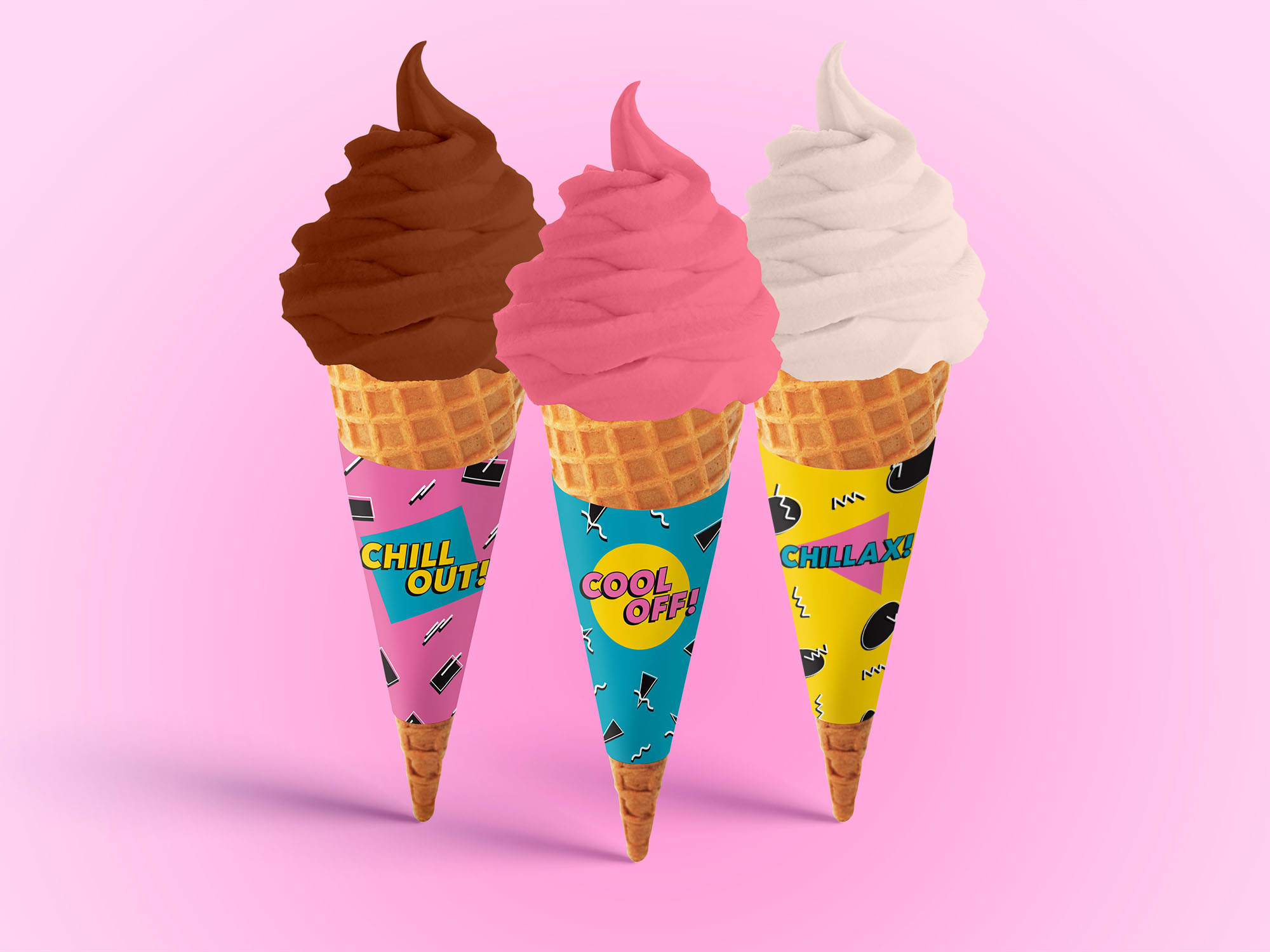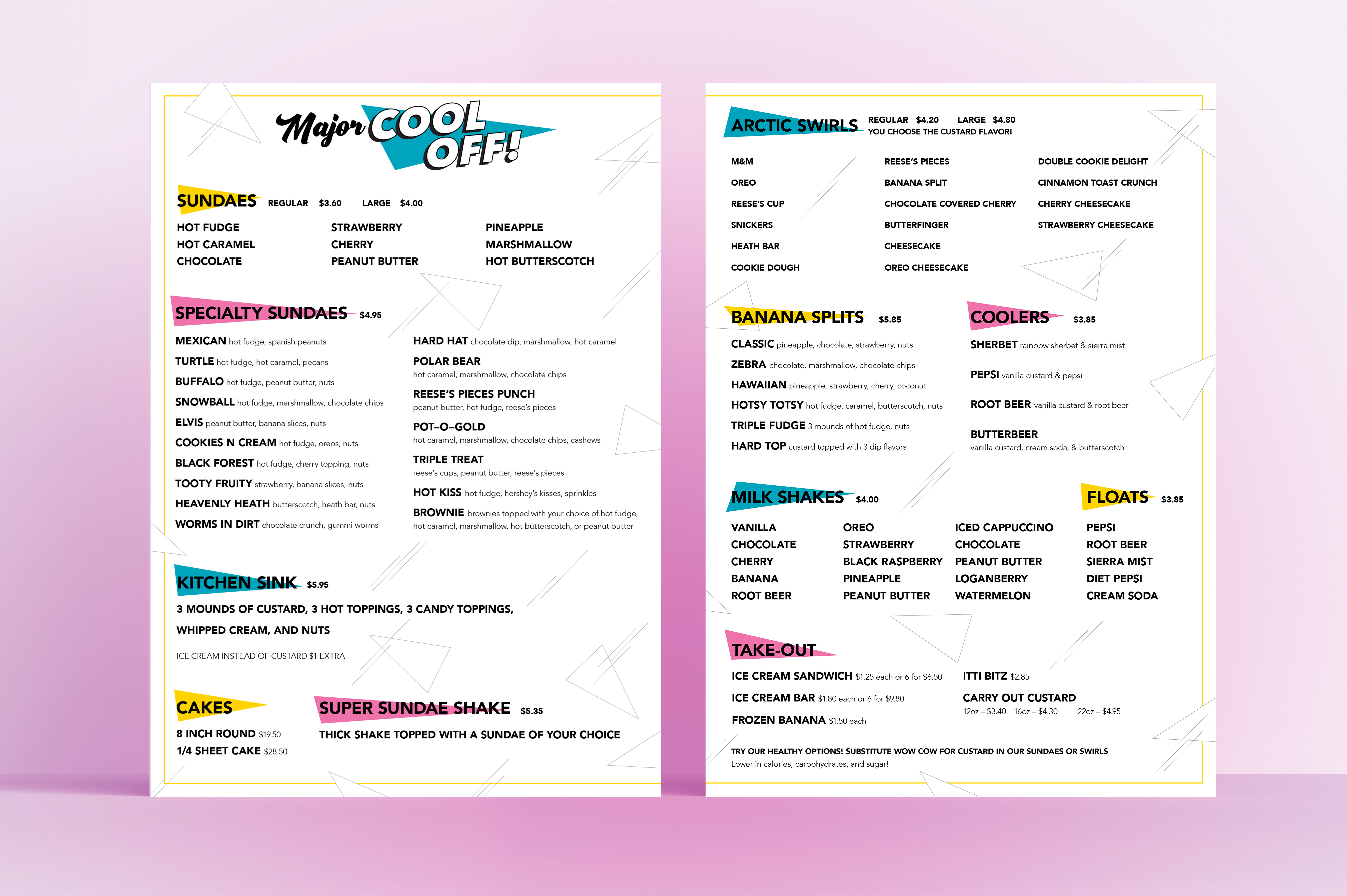 The new look is comprised of saturated and bright colors, crazy shapes, patterns and visual energy which are often found in the pop design style of 1980’s. The foundational color scheme is balanced with tints and shades of primary colors that were often used in this iconic era of design. The logo has been reimagined using a cursive, retro-styled font to help convey the “feel” of ice cream, while the colors further communicate the optimistic, lively and family-friendly atmosphere.
