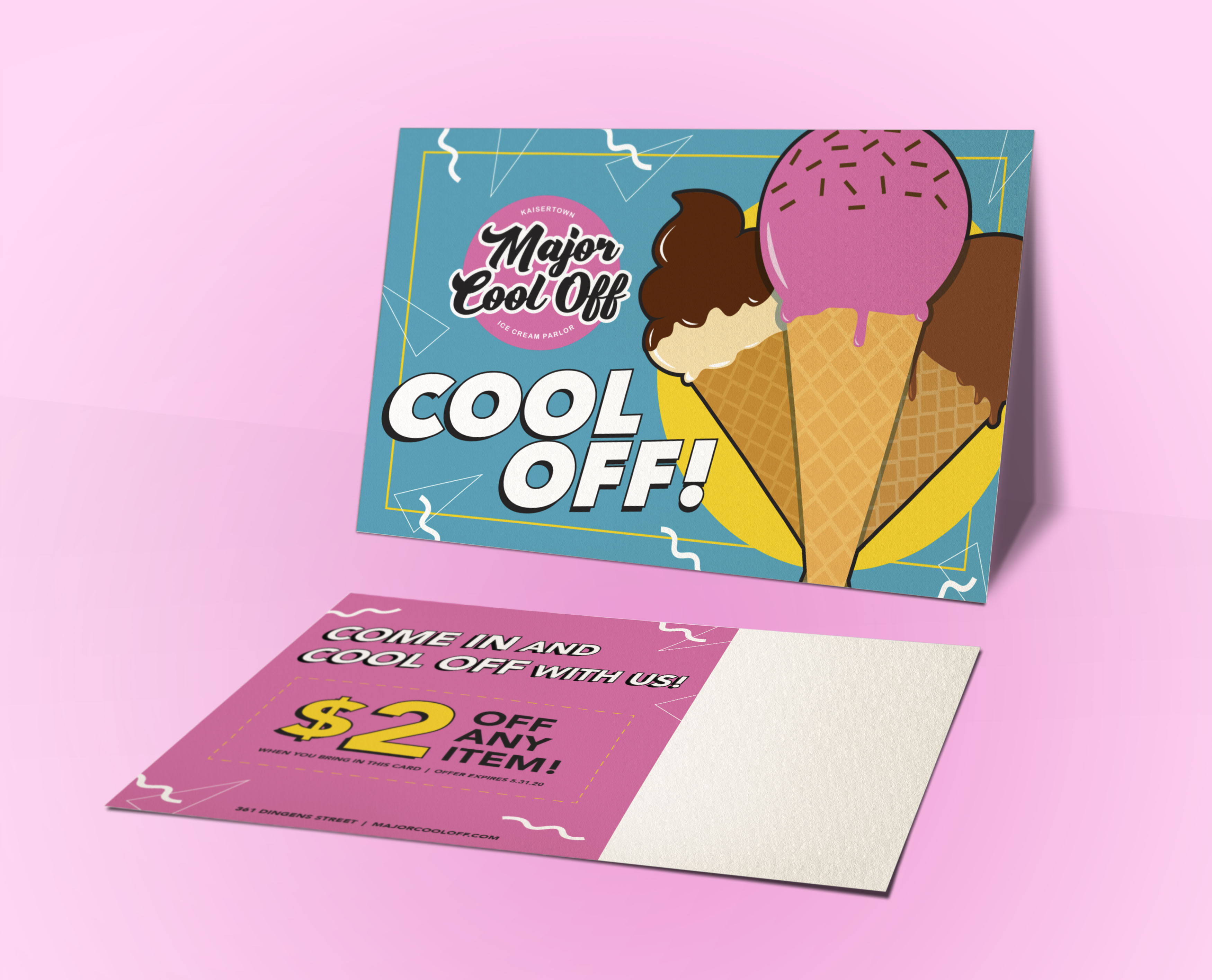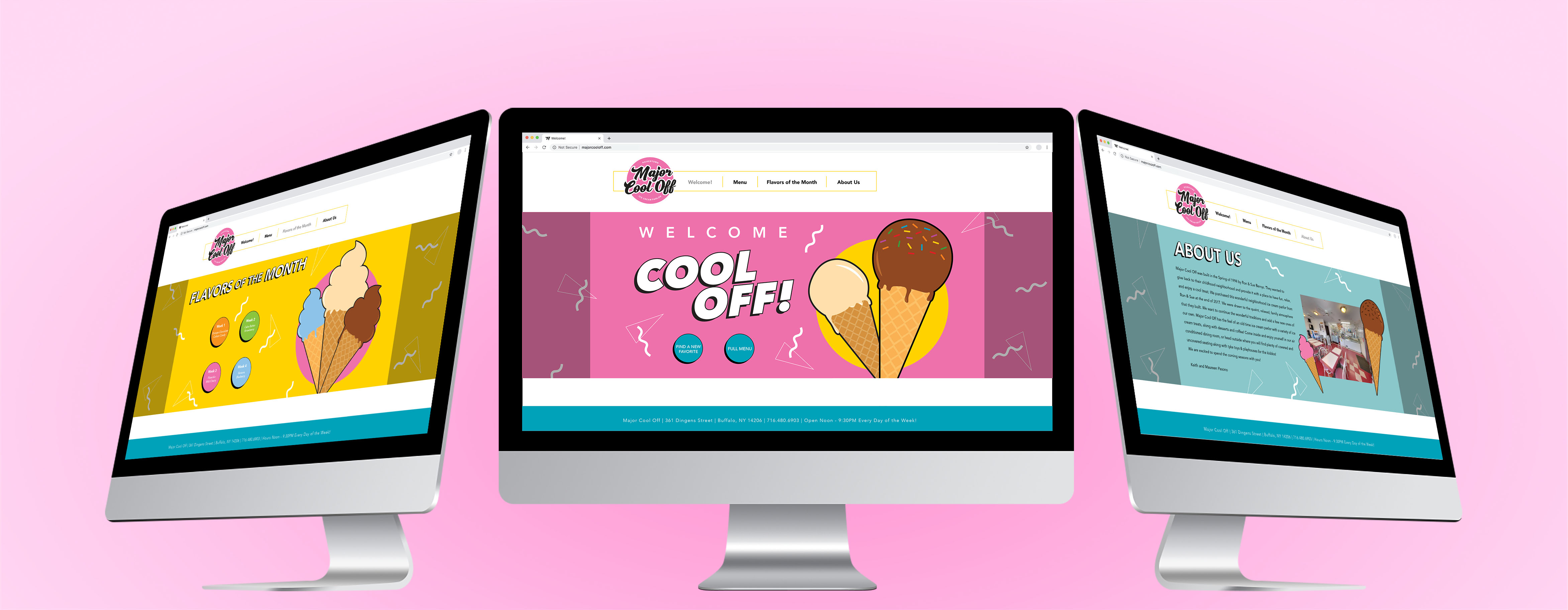 Major Cool Off is wonderful ice cream shop in Kaisertown with a welcoming vibe and fun environment. It has been a family favorite destination for years with aesthetics in need of unity and refreshment. Amping up their look with a more modern feel balanced with retro design seemed to be the upgrade they deserved, and was what I chose to do for my Senior Project at Villa Maria College.